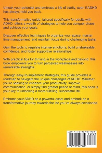 Achieve a Calmer, More Organized Life-Even If ADHD Has Always Held You Back Is ADHD leaving you overwhelmed and frustrated? You're not alone-and change is possible. This supportive guide, designed specifically for adults with ADHD, offers practical strategies to boost focus, manage relationships, and reduce chaos. Inside, discover proven tools to: - Organize your workspace for productivity and fewer distractions - Master time management and meet deadlines with less stress - Maintain focus, even during long or tedious tasks - Plan and prioritize effectively, despite executive function challenges - Regulate emotions and build self-esteem - Communicate about ADHD with loved ones for better understanding - Manage motivation, memory, and energy for consistent performance - Reduce stress quickly and find supportive communities Unlike other books, this guide is empathetic, straightforward, and packed with actionable tips you can use right away. If you're ready to turn ADHD struggles into strengths and enjoy a calmer, more fulfilling life, have a read of "Effective ADHD Management for Adults" now.