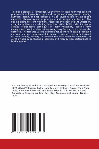 This book provides a comprehensive overview of cattle farm management practices. It addresses key topics such as general management, housing, nutrition, health, and reproduction. It also covers various infectious and metabolic diseases, as well as pre-, peri-, and post-partum disorders. The book explains different nutritional resources and their efficient utilization, alongside guidance on selecting breeding cattle. Additionally, it explores assisted reproductive techniques in dairy husbandry. Routine farm management practices aimed at improving dairy farming outcomes are also discussed. This resource will be invaluable for scientists in cattle production and reproduction, progressive dairy farmers, breeders, and those involved in cattle rearing, helping to improve the socio-economic conditions of cattle owners by enhancing production and reproduction performance in bovine species.