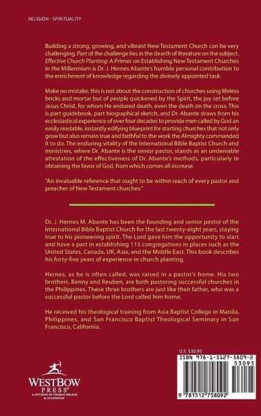 Building a strong, growing, and vibrant New Testament Church can be very challenging. Part of the challenge lies in the dearth of literature on the subject. Effective Church Planting: A Primer on Establishing New Testament Churches in the Millennium is Dr. J. Hernes Abante's humble personal contribution to the enrichment of knowledge regarding the divinely appointed task. Make no mistake, this is not about the construction of churches using lifeless bricks and mortar but of people quickened by the Spirit, the joy set before Jesus Christ, for whom He endured death, even the death on the cross. This is part guidebook, part biographical sketch, and Dr. Abante draws from his ecclesiastical experience of over four decades to provide men called by God an easily readable, instantly edifying blueprint for starting churches that not only grow but also remain true and faithful to the work the Almighty commanded it to do. The enduring vitality of the International Bible Baptist Church and ministries, where Dr. Abante is the senior pastor, stands as an undeniable attestation of the effectiveness of Dr. Abante's methods, particularly in obtaining the favor of God, from which comes all increase. "An invaluable reference that ought to be within reach of every pastor and preacher of New Testament churches."