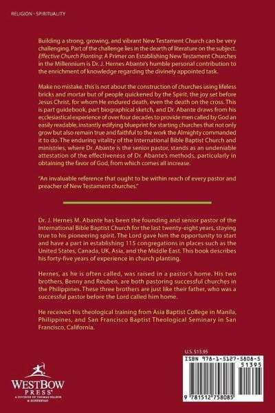 Building a strong, growing, and vibrant New Testament Church can be very challenging. Part of the challenge lies in the dearth of literature on the subject. Effective Church Planting: A Primer on Establishing New Testament Churches in the Millennium is Dr. J. Hernes Abante's humble personal contribution to the enrichment of knowledge regarding the divinely appointed task. Make no mistake, this is not about the construction of churches using lifeless bricks and mortar but of people quickened by the Spirit, the joy set before Jesus Christ, for whom He endured death, even the death on the cross. This is part guidebook, part biographical sketch, and Dr. Abante draws from his ecclesiastical experience of over four decades to provide men called by God an easily readable, instantly edifying blueprint for starting churches that not only grow but also remain true and faithful to the work the Almighty commanded it to do. The enduring vitality of the International Bible Baptist Church and ministries, where Dr. Abante is the senior pastor, stands as an undeniable attestation of the effectiveness of Dr. Abante's methods, particularly in obtaining the favor of God, from which comes all increase. "An invaluable reference that ought to be within reach of every pastor and preacher of New Testament churches."