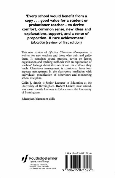 This latest new edition of Effective Classroom Management is written for new teachers and those who train and guide them. It combines sound practical advice on lesson organisation and teaching methods with an exploration of teachers' feelings about themselves and the children they teach. In this second edition, classroom management is considered from four aspects: management in the classroom; mediation with individuals; modification of behaviour and monitoring school discipline.