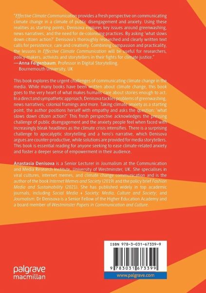 This book explores the urgent challenges of communicating climate change in the media. While many books have been written about climate change, this book goes to the very heart of what makes humans care about stories enough to act. In a direct and sympathetic approach, Denisova tackles problems of greenwashing, news narratives, colonial framings and more. Taking climate anxiety as a starting point, the author positions herself with empathy and asks the question: 'what slows down citizen action?' This fresh perspective acknowledges the pressing challenge of public disengagement and the anxiety people feel when faced with increasingly bleak headlines as the climate crisis intensifies. There is a surprising challenge to apocalyptic storytelling and a hero's narrative, which Denisova argues are counter-productive, while solutions are provided for media storytellers. This book is essential reading for anyone seeking to ease climate-related anxiety and foster a deeper sense of empowerment in their audience.