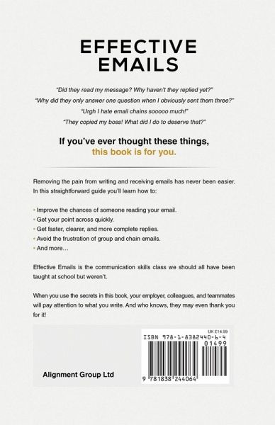 Do you want less frustrating emails at work? Would you like replies that actually answer your questions? How about getting your team to send shorter, clearer messages? If you answered yes to any of these questions this book is for you (and your team!) Effective Emails is a straightforward guide to removing the pain from writing and receiving emails at work. It is the communication skills class we should all have been taught at school but weren't. NOTE: This is NOT a sales & marketing book. You will not learn anything about sending cold emails, setting up auto sequences, or selling or any kind. This book is focused on how to communicate effectively with colleagues, clients, and the people you work with day to day. This book shows you the formula for a clear, concise business emails. You'll learn how to: Improve the chances of someone reading your email. Get your point across quickly. Get faster, clearer, and more complete replies. Avoid the frustration of group and chain emails. And more... In each chapter Chris Fenning shares techniques and step-by-step methods developed in his own career, combined with advice from other communication experts. Each page turns vague advice of "write shorter messages" into simple frameworks you can apply to every email you send at work. Examples are given throughout the book along with a case study that shows how to turn a long, unstructured email into something clear and easy to understand. If you have you ever thought to yourself: "Did they read my message? Why haven't they replied yet?" "Why did they only answer one question when I obviously sent them three?" "Urgh I hate email chains sooooo much!" "They copied my boss! What did I do to deserve that?" If you've ever thought these things, this book is for you. Then this book is for you. Inside you will find the exact steps you can take to never thinking those things again. When you use the secrets in this book, your employer, colleagues, and team mates will pay attention to what you write. And who knows, they may even thank you for it! FAQ Question: Is this just another book telling me what I should or should not write as a greeting? Answer: Definitely not. This book is about effective business communication via email, the word you use to greet someone is one of the least important things when it comes to conveying your message clearly. In this book there is perhaps one page about greetings. The rest is about how to create and structure meaningful messages. Question: Will this book help me write sales and marketing messages? Answer: No it will not. There is no sales or marketing methods in this book. The focus of Effective Emails is to give people tools to help them communicate better with their team mates, colleagues, managers, clients, and other people they interact with in the normal course of their work. Sales teams will benefit from this book when communicating with other teams inside their company, but not when selling to customers.