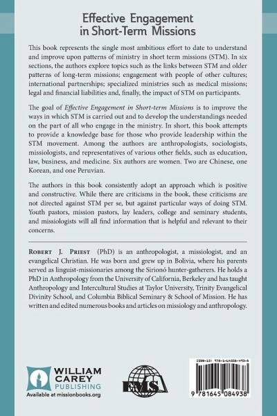 This book represents the single most ambitious effort to date to understand and improve upon patterns of ministry in short term missions (STM). In six sections, the authors explore topics such as the links between STM and older patterns of long-term missions; engagement with people of other cultures; international partnerships; specialized ministries such as medical missions; legal and financial liabilities and, finally, the impact of STM on participants.The goal of Effective Engagement in Short-term Missions is to improve the ways in which STM is carried out and to develop the understandings needed on the part of all who engage in the ministry. In short, this book attempts to provide a knowledge base for those who provide leadership within the STM movement. Among the authors are anthropologists, sociologists, missiologists, and representatives of various other fields, such as education, law, business, and medicine. Six authors are women. Two are Chinese, one Korean, and one Peruvian.The authors in this book consistently adopt an approach which is positive and constructive. While there are criticisms in the book, these criticisms are not directed against STM per se, but against particular ways of doing STM. Youth pastors, mission pastors, lay leaders, college and seminary students, and missiologists will all find information that is helpful and relevant to their concerns.