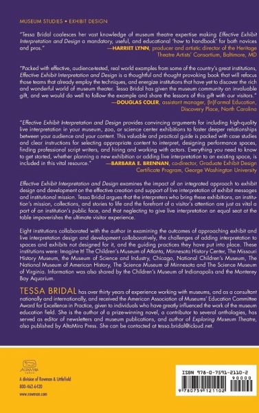 Effective Exhibit Interpretation and Design examines the impact of an integrated approach to exhibit design and development on the effective creation and support of live interpretation of exhibit messages and institutional mission. Bridal argues that the interpreters who bring these exhibitions, an institution's mission, collections, and stories to life, and the forefront of a visitor's attention are just as vital a part of an institution's public face, and that neglecting to give live interpretation an equal seat at the table impoverishes the ultimate visitor experience.