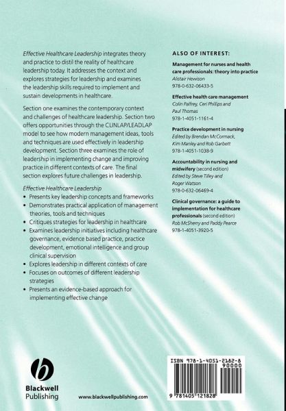 Effective Healthcare Leadership integrates theory and practice to distil the reality of healthcare leadership today. It addresses the context and explores strategies for leadership and examines the leadership skills required to implement and sustain developments in healthcare. Section one examines the contemporary context and challenges of healthcare leadership. Section two offers opportunities through the CLINLAP/LEADLAP model to see how modern management ideas, tools and techniques are used effectively in leadership development. Section three examines the role of leadership in implementing change and improving practice in different contexts of care. The final section explores future challenges in leadership.