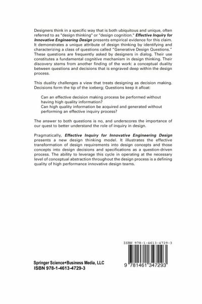 Effective Inquiry for Innovative Engineering Design presents empirical evidence for this claim. It demonstrates a unique attribute of design thinking by identifying and characterizing a class of questions called "Generative Design Questions". These questions are frequently asked by designers in dialog. Their use constitutes a fundamental cognitive mechanism in design thinking. Their discovery stems from another finding of the work: a conceptual duality between questions and decisions that is engraved deep within the design process. This duality challenges a view that treats designing as…mehr