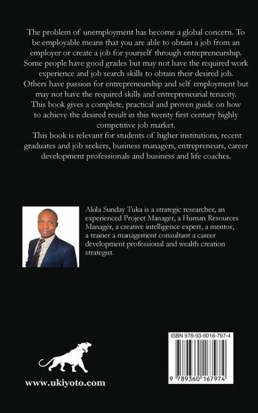 "The problem of unemployment has become a global concern. To be employable means that you are able to obtain a job from an employer or create a job for yourself through entrepreneurship. Some people have good grades but may not have the required work experience and job search skills to obtain their desired job. Others have passion for entrepreneurship and self employment but may not have the required skills and entrepreneurial tenacity. This book gives a complete, practical and proven guide on how to achieve the desired result in this twenty first century highly competitive job market. This book is relevant for students of higher institutions, recent graduates and job seekers, business managers, entrepreneurs, career development professionals and business and life coaches."