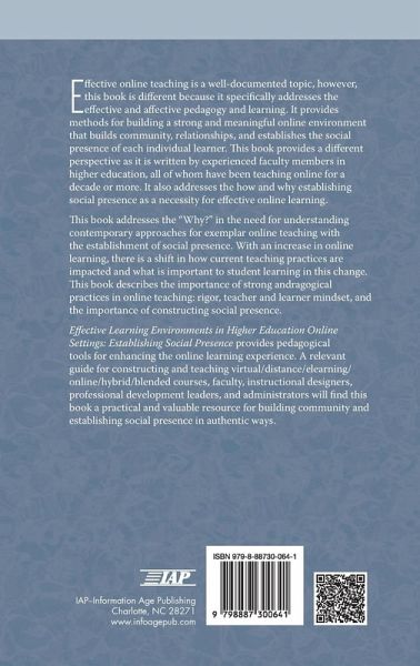 Effective online teaching is a well-documented topic, however, this book is different because it specifically addresses the effective and affective pedagogy and learning. It provides methods for building a strong and meaningful online environment that builds community, relationships, and establishes the social presence of each individual learner. This book provides a different perspective as it is written by experienced faculty members in higher education, all of whom have been teaching online for a decade or more. It also addresses the how and why establishing social presence as a necessity for effective online learning. This book addresses the "Why?" in the need for understanding contemporary approaches for exemplar online teaching with the establishment of social presence. With an increase in online learning, there is a shift in how current teaching practices are impacted and what is important to student learning in this change. This book describes the importance of strong andragogical practices in online teaching: rigor, teacher and learner mindset, and the importance of constructing social presence. Effective Learning Environments in Higher Education Online Settings: Establishing Social Presence provides pedagogical tools for enhancing the online learning experience. A relevant guide for constructing and teaching virtual/distance/elearning/online/hybrid/blended courses, faculty, instructional designers, professional development leaders, and administrators will find this book a practical and valuable resource for building community and establishing social presence in authentic ways.