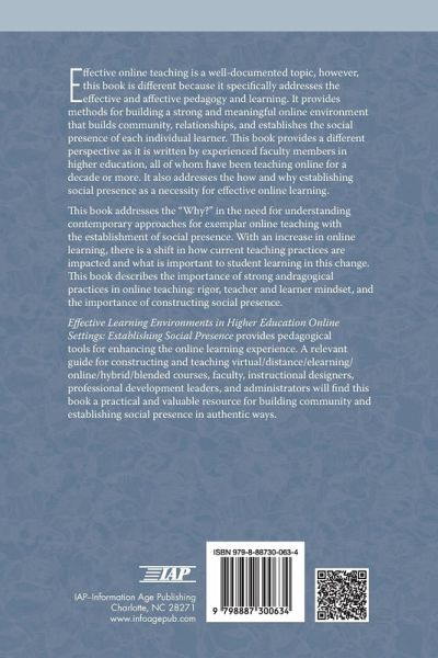 Effective online teaching is a well-documented topic, however, this book is different because it specifically addresses the effective and affective pedagogy and learning. It provides methods for building a strong and meaningful online environment that builds community, relationships, and establishes the social presence of each individual learner. This book provides a different perspective as it is written by experienced faculty members in higher education, all of whom have been teaching online for a decade or more. It also addresses the how and why establishing social presence as a necessity for effective online learning. This book addresses the "Why?" in the need for understanding contemporary approaches for exemplar online teaching with the establishment of social presence. With an increase in online learning, there is a shift in how current teaching practices are impacted and what is important to student learning in this change. This book describes the importance of strong andragogical practices in online teaching: rigor, teacher and learner mindset, and the importance of constructing social presence. Effective Learning Environments in Higher Education Online Settings: Establishing Social Presence provides pedagogical tools for enhancing the online learning experience. A relevant guide for constructing and teaching virtual/distance/elearning/online/hybrid/blended courses, faculty, instructional designers, professional development leaders, and administrators will find this book a practical and valuable resource for building community and establishing social presence in authentic ways.