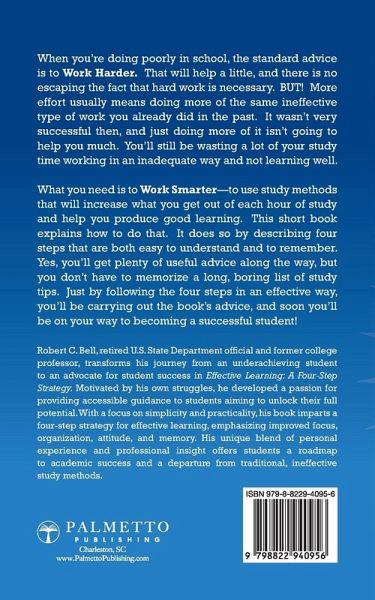 When you're doing poorly in school, the standard advice is to Work Harder. That will help a little, and there is no escaping the fact that hard work is necessary. BUT! More effort usually means doing more of the same ineffective type of work you already did in the past. It wasn't very successful then, and just doing more of it isn't going to help you much. You'll still be wasting a lot of your study time working in an inadequate way and not learning well. What you need is to Work Smarter-to use study methods that will increase what you get out of each hour of study and help you produce good learning. This short book explains how to do that. It does so by describing four steps that are both easy to understand and to remember. Yes, you'll get plenty of useful advice along the way, but you don't have to memorize a long, boring list of study tips. Just by following the four steps in an effective way, you'll be carrying out the book's advice, and soon you'll be on your way to becoming a successful student!