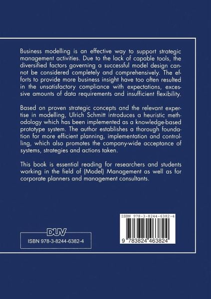 Business modelling is an effective way to support strategic management activities. Due to the lack of capable tools, the diversified factors governing a successful model design cannot be considered completely and comprehensively. The efforts to provide more business insight have too often resulted in the unsatisfactory compliance with expectations, excessive amounts of data requirements and insufficient flexibility. Based on proven strategic concepts and the relevant expertise in modelling, Ulrich Schmitt introduces a heuristic methodology which has been implemented as a knowledge-based prototype system. The author establishes a thorough foundation for more efficient planning, implementation and controlling, which also promotes the company-wide acceptance of systems, strategies and actions taken.