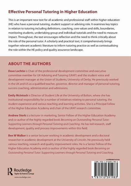 Andrew Stork is a lecturer in marketing, Senior Fellow of the Higher Education Academy and co-author of the highly regarded book Becoming an Outstanding Personal Tutor: Supporting Learners through Personal Tutoring and Coaching. As well as presenting at national and international conferences he has published research in personal tutoring and coaching. He has held the roles of cross-institutional quality lead for personal tutoring and student experience, course leader of the postgraduate certificate in education course, and a variety of curriculum leadership, quality and staff development positions. He is a chartered marketer and, prior to working in education, worked in marketing management and consultancy roles. Ben Walker is a senior lecturer and doctoral researcher in academic development at the University of Lincoln and co-authored the highly regarded Becoming an Outstanding Personal Tutor: Supporting Learners through Personal Tutoring and Coaching (2015). He has designed and delivered staff development on personal tutoring, is a member of the UK Advising and Tutoring (UKAT) Professional Development committee and a Senior Fellow of the Higher Education Academy. Previously he held the roles of manager of personal tutoring, head of department for English, course leader of the Postgraduate Certificate in Education course and English teacher. Dave Lochtie is Chair of the Professional Development Committee and Executive Committee member for UK Advising and Tutoring (UKAT) which represents and supports personal tutors and academic advisors across the UK. He is also the Student Opportunities Manager at the Union of Students, University of Derby having previously worked at the Universities of New Orleans, Roehampton and Bournemouth in the management of Personal Tutoring, Success Coaching, Administration and Admissions. Prior to this he worked as a qualified primary school teacher. He also served as an elected Director, Trustee and Governor of the University of Roehampton and Bournemouth University Students Union. Emily McIntosh is Director of Student Life at the University of Bolton where she is have responsible for welcome and induction, personal tutoring, student learning development and peer learning as well as contributing to a variety of cross-institutional strategic initiatives. Her research interests extend to student peer learning, transitions, personal tutoring and student resilience. She is an Executive Committee member of UK Advising and Tutoring (UKAT) and a member of the UKAT Research Committee. She is also the network coordinator for the European First Year Experience Network (EFYE). She previously held positions at the University of Manchester, the University of Liverpool and Keele University working in a variety of roles in teaching & learning, student support and the broader student experience.