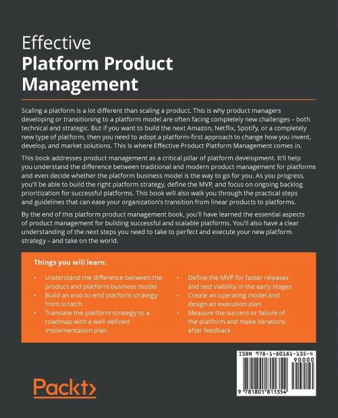 Turn your platform into the next big thing with expert advice to scale and implement a proven growth roadmap across multiple channels Key Features:Gain expert insight about platform business models and how they're different to linear products Explore the end-to-end platform life cycle, from developing a strategy to measuring the outcome Follow real-life examples to discover the most effective growth strategies your platform Book Description: Scaling a platform is a lot different than scaling a product. This is why product managers developing or transitioning to a platform model are often facing completely new challenges - both technical and strategic. But if you want to build the next Amazon, Netflix, Spotify, or a completely new type of platform, then you need to adopt a platform-first approach to change how you invent, develop, and market solutions. This is where Effective Product Platform Management comes in. This book addresses product management as a critical pillar of platform development. It'll help you understand the difference between traditional and modern product management for platforms and even decide whether the platform business model is the way to go for you. As you progress, you'll be able to build the right platform strategy, define the MVP, and focus on ongoing backlog prioritization for successful platforms. This book will also walk you through the practical steps and guidelines that can ease your organization's transition from linear products to platforms. By the end of this platform product management book, you'll have learned the essential aspects of product management for building successful and scalable platforms. You'll also have a clear understanding of the next steps you need to take to perfect and execute your new platform strategy - and take on the world. What You Will Learn:Understand the difference between the product and platform business model Build an end-to-end platform strategy from scratch Translate the platform strategy to a roadmap with a well-defined implementation plan Define the MVP for faster releases and test viability in the early stages Create an operating model and design an execution plan Measure the success or failure of the platform and make iterations after feedback Who this book is for: If you're a product manager, product owner, product director, or a business executive working on a platform strategy and its day-to-day execution, then this book is for you. It will also be useful for change managers and program managers tasked with transitioning from products to platforms. You won't need any prior knowledge of platform strategy or platform transitioning before you get started, since the book covers all the basics - but taking notes to reflect on your journey as you work through the practical examples in this book is recommended.