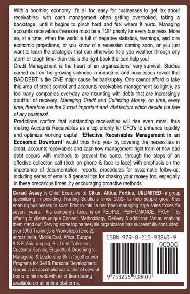 The last few years, saw many businesses enjoy a booming economy, and during these good times, it's all too easy for businesses to get lax about receivables- with cash management often getting overlooked, taking a backstage, until it begins to pinch hard and feel where it hurts. Managing accounts receivables therefore must be a TOP priority for every business. At a time, when the world is full of negative statistics, warnings, and dire economic projections, and you know of a recession coming soon, or you just simply want to learn the strategies that can otherwise help you weather through any storm or tough time- this is the book! Credit Management is the heart of an organizations very survival. Many studies carried out on the growing sickness in industries & businesses reveal that BAD DEBT is the ONE major cause for bankruptcy. One cannot afford to take this area of credit control & accounts receivables management so lightly, as too many companies everyday are mounting with debts that are increasingly doubtful of recovery. A company can have the finest product, a superb sales record and the most dedicated workforce, but if it does not get paid for its goods, and on time, it will die. An unpaid debt is an unsecured loan being financed by your company. When you no longer control your debtors, the cost of financing your company's cash flow is at the mercy of those very same debtors. If a business wishes to survive and prosper in today's economic environment it must pay close attention to all of this. Managing Credit and Collecting Money (your Accounts Receivables), on time, every time, therefore are the 2 most important and vital factors which decide the fate of any business! Predictions confirm that outstanding receivables will rise even more, thus making Accounts Receivables as a top priority for CFO's to enhance liquidity and optimize working capital. Unpaid invoices and past due receivables will cost a lot- enabling businesses to suffer in a number of ways and can even pull down the entire business. But a consistent and steady cash flow will keep businesses all oiled up and running smoothly enabling one to plan a future of growth including, expanding, hiring more employees, investing in other companies, diversifying product lines, and making one look good to investors and more. This book: 'Effective Receivables Management in an Economic Downturn!' would tremendously help you - by covering the necessities in credit, accounts receivables and cash flow management right from an understanding of how bad debt occurs with methods to prevent the same, through the steps of an effective collection call (both on phone and face to face) with emphasis on the importance of documentation, reports, procedures for systematic follow-up; including series of email letters and general tips for chasing your money too, especially in these precarious times, by encouraging proactive methods! By the time you finish reading the book, you would have learnt to manage credit, using planned preventive measures (the most vital part!), would have learnt to develop a complete systematic collection program, gained confidence in collecting your receivables and have acquired several new ideas for immediate use, including taking back an Action Plan which can be put to immediate practice. The book will help everyone whose responsibility includes collecting money from customers- for any type of business, the small or big businesses, the credit control and accounts receivables personnel, as well as every businessman/ manager or for those who would just like to increase their knowledge, as almost every organization today is faced with this major problem, especially during these down times- to eventually help survive and thrive into the future, by enabling businesses successfully navigate the uncertainty and outperform the competition- emerging profitable and victorious!