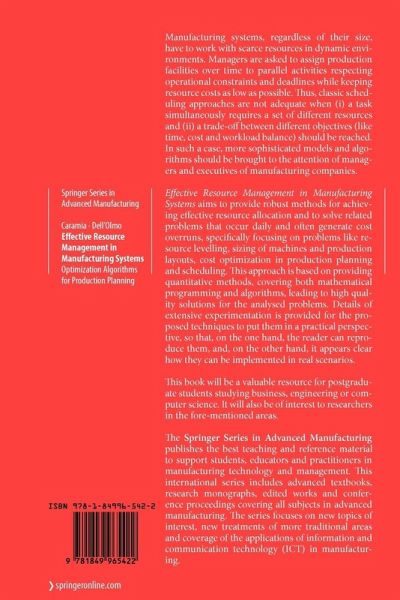 Owing to its large operational impact, resource management is increasingly becoming an important function in manufacturing systems. Contributions on how to organize or manage this function are always appreciated. This book aims to provide robust methods for achieving effective resource allocation in dynamic environments, specially focussing on problems such as resource levelling, sizing of machines and production layouts, cost optimization in production planning and scheduling. Details of extensive experimentation are provided for the proposed techniques to put them in a practical perspective. This is particularly useful as it helps the reader to reproduce these techniques and implement them in real scenarios.