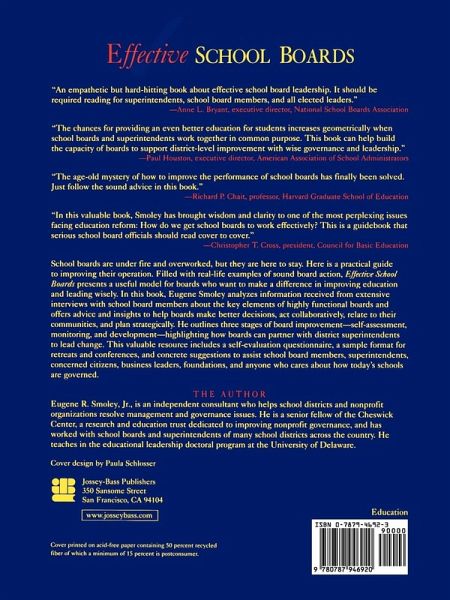 "An empathetic but hard-hitting book about effective school board leadership. It should be required reading for superintendents, school board members, and all elected leaders." --Anne L. Bryant, executive director, National School Boards Association "The chances for providing an even better education for students increases geometrically when school boards and superintendents work together in common purpose. This book can help build the capacity of boards to support district-level improvement with wise governance and leadership." --Paul Houston, executive director, American Association of School Administrators School boards are under fire and overworked, but they are here to stay. Here is a practical guide to improving their operation. Filled with real-life examples of sound board action, "Effective School Boards" presents a useful model for boards who want to make a difference in improving education and leading wisely. In this book, Eugene Smoley analyzes information received from extensive interviews with school board members about the key elements of highly functional boards and offers advice and insights to help boards make better decisions, act collaboratively, relate to their communities, and plan strategically. He outlines three stages of board improvement--self-assessment, monitoring, and development--highlighting how boards can partner with district superintendents to lead change. Practical tools for improvement include a self-evaluation questionnaire, a sample format for retreats and conferences, and concrete suggestions to assist school board members, superintendents, concerned citizens, business leaders, foundations, and anyone who cares about how today's schools aregoverned.