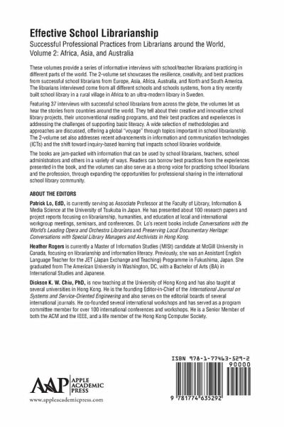 These volumes provide a series of informative interviews with school/teacher librarians practicing in different parts of the world. The 2-volume set showcases the resilience, creativity, and best practices from successful school librarians from Europe, Asia, Africa, Australia, and North and South America. The librarians interviewed come from all different schools and schools systems, from a tiny recently built school library in a rural village in Africa to an ultra-modern library in Sweden. Featuring 37 interviews with successful school librarians from across the globe, the volumes let us hear the stories from countries around the world. They tell about their creative and innovative school library projects, their unconventional reading programs, and their best practices and experiences in addressing the challenges of supporting basic literacy. A wide selection of methodologies and approaches are discussed, offering a global "voyage" through topics important in school librarianship. The 2-volume set also addresses recent advancements in information and communication technologies (ICTs) and the shift toward inquiry-based learning that impacts school libraries worldwide. The books are packed with information that can be used by school librarians, teachers, school administrators and others in a variety of ways. Readers can borrow best practices from the experiences presented in the book, and the volumes can also serve as a strong voice for practicing school librarians and the profession, through expanding the opportunities for professional sharing in the international school library community.