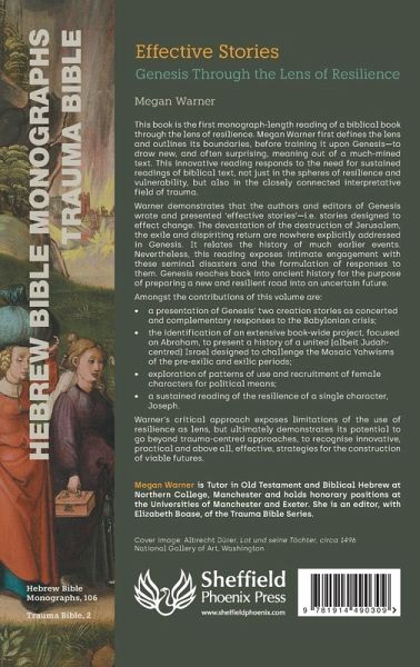 This book is the first monograph-length reading of a biblical book through the lens of resilience. Megan Warner first defines the lens and outlines its boundaries, before training it upon Genesis-to draw new, and often surprising, meaning out of a much-mined text. This innovative reading responds to the need for sustained readings of biblical text, not just in the spheres of resilience and vulnerability, but also in the closely connected interpretative field of trauma. Warner demonstrates that the authors and editors of Genesis wrote and presented 'effective stories'-i.e. stories designed to effect change. The devastation of the destruction of Jerusalem, the exile and dispiriting return are nowhere explicitly addressed in Genesis. It relates the history of much earlier events. Nevertheless, this reading exposes intimate engagement with these seminal disasters and the formulation of responses to them. Genesis reaches back into ancient history for the purpose of preparing a new and resilient road into an uncertain future. Amongst the contributions of this volume are:¿- a presentation of Genesis' two creation stories as concerted and complementary responses to the Babylonian crisis;¿- the identification of an extensive book-wide project, focused on Abraham, to present a history of a united (albeit Judah-centred) Israel designed to challenge the Mosaic Yahwisms of the pre-exilic and exilic periods;¿- exploration of patterns of use and recruitment of female characters for political means; and¿- a sustained reading of the resilience of a single character, Joseph. Warner's critical approach exposes limitations of the use of resilience as lens, but ultimately demonstrates its potential to go beyond trauma-centred approaches, to recognise innovative, practical and above all, effective, strategies for the construction of viable futures.