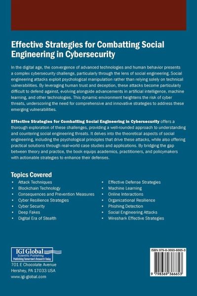 In the digital age, the convergence of advanced technologies and human behavior presents a complex cybersecurity challenge, particularly through the lens of social engineering. Social engineering attacks exploit psychological manipulation rather than relying solely on technical vulnerabilities. By leveraging human trust and deception, these attacks become particularly difficult to defend against, evolving alongside advancements in artificial intelligence, machine learning, and other technologies. This dynamic environment heightens the risk of cyber threats, underscoring the need for comprehensive and innovative strategies to address these emerging vulnerabilities. Effective Strategies for Combatting Social Engineering in Cybersecurity offers a thorough exploration of these challenges, providing a well-rounded approach to understanding and countering social engineering threats. It delves into the theoretical aspects of social engineering, including the psychological principles that drive these attacks, while also offering practical solutions through real-world case studies and applications. By bridging the gap between theory and practice, the book equips academics, practitioners, and policymakers with actionable strategies to enhance their defenses.