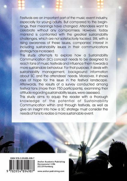 Festivals are an important part of the music event industry, especially for young adults. But compared to the beginnings, their meanings have changed: Attendees want to celebrate without any compromises. However, today mankind is confronted with the greatest sustainability challenges, which are not satisfactorily tackled. Still, with a rising awareness of these issues, companies' interest in including sustainability issues in their communications strategy has increased.