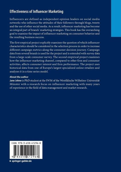 Influencers are defined as independent opinion leaders on social media networks who influence the attitudes of their followers through blogs, tweets and the use of other social media. As a result, influencer marketing has become an integral part of brands' marketing strategies. This book has the overarching goal to examine the impact of influencer marketing on consumer behavior and the resulting business success. The first empirical project explicitly examines the question of which influencer characteristics should be considered in the selection process in order to increase different campaign metrics along the consumer decision journey. Campaign data from several brands is used for the project and is extended with survey data from a large-scale consumer survey. The second empirical project examines how the influencer marketing channel, compared to other firm and consumer activities, affects consumer interest and firm performance. The project uses historical data from one of Europe'slargest specialized online retailers and analyzes it in a time series model.