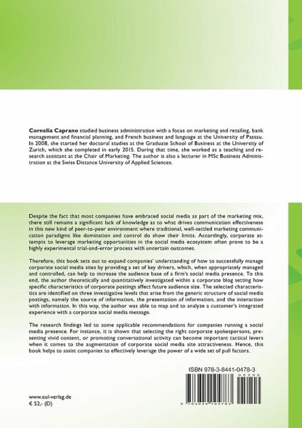 Despite the fact that most companies have embraced social media as part of the marketing mix, there still remains a significant lack of knowledge as to what drives communication effectiveness in this new kind of peer-to-peer environment where traditional, well-settled marketing communication paradigms like domination and control do show their limits. Accordingly, corporate attempts to leverage marketing opportunities in the social media ecosystem often prove to be a highly experimental trial-and-error process with uncertain outcomes. Therefore, this book sets out to expand companies¿ understanding of how to successfully manage corporate social media sites by providing a set of key drivers, which, when appropriately managed and controlled, can help to increase the audience base of a firm¿s social media presence. To this end, the author theoretically and quantitatively investigated within a corporate blog setting how specific characteristics of corporate postings affect future audience size. The selected characteristics are identified on three investigative levels that arise from the generic structure of social media postings, namely the source of information, the presentation of information, and the interaction with information. In this way, the author was able to map and to analyze a customer¿s integrated experience with a corporate social media message. The research findings led to some applicable recommendations for companies running a social media presence. For instance, it is shown that selecting the right corporate spokespersons, presenting vivid content, or promoting conversational activity can become important tactical levers when it comes to the augmentation of corporate social media site attractiveness. Hence, this book helps to assist companies to effectively leverage the power of a wide set of pull factors.