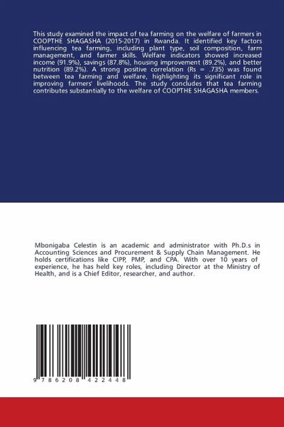 This study examined the impact of tea farming on the welfare of farmers in COOPTHE SHAGASHA (2015-2017) in Rwanda. It identified key factors influencing tea farming, including plant type, soil composition, farm management, and farmer skills. Welfare indicators showed increased income (91.9%), savings (87.8%), housing improvement (89.2%), and better nutrition (89.2%). A strong positive correlation (Rs = .735) was found between tea farming and welfare, highlighting its significant role in improving farmers' livelihoods. The study concludes that tea farming contributes substantially to the welfare of COOPTHE SHAGASHA members.