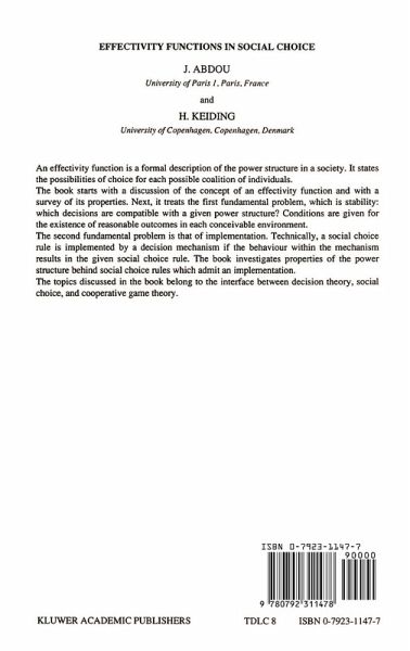 The present book treats a highly specialized topic, namely effec tivity functions, which are a tool for describing the power structure implicit in social choice situations of various kind. One of the ad vantages of effectivity functions is that they seem to contain exactly the information which is needed in several problems of implementa tion, that is in designing the rules for individual behaviour given that this behaviour at equilibrium should result in a prescribed functional connection between preferences and outcome. We shall be interested in both formal properties of effectiv ity functions and applications of them in social choice theory, and among such applications in particular the implementation problem. This choice of emphasis necessarily means that some other topics are treated only superficially or not at all. We do not attempt to cover all contributions to the field, rather we try to put some of the results together in order to get a reasonably coherent theory about the role of the power structure in cooperative implementation. The authors are indebted to many persons for assistance and advice during the work on this book. In particular, we would like to thank Peter Fristrup and Bodil Hansen for critical reading of the manuscript, and Lene Petersen for typesetting in '.lEX.
