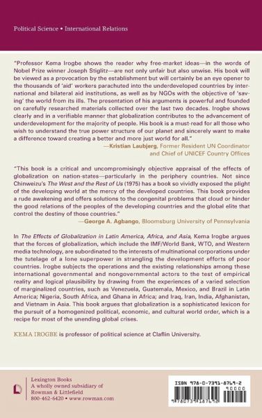 In crisp and accessible language, TheEffects of Globalization in Latin America, Africa, and Asia challenges conventional wisdom that often provides one-sided views of globalization. The book brings to light that which many scholars ignore: the symbiotic linkages within a global supranational regime consisting of MNCs, WTO, the IMF/World Bank, western media technology, and the lone superpower that are the principal actors in the global political economy.
