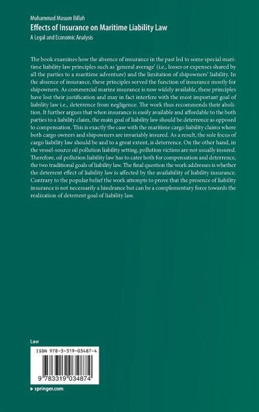 The book examines how the absence of insurance in the past led to some special maritime liability law principles such as 'general average' (i.e., losses or expenses shared by all the parties to a maritime adventure) and the limitation of shipowners' liability. In the absence of insurance, these principles served the function of insurance mostly for shipowners. As commercial marine insurance is now widely available, these principles have lost their justification and may in fact interfere with the most important goal of liability law i.e., deterrence from negligence. The work thus recommends their abolition. It further argues that when insurance is easily available and affordable to the both parties to a liability claim, the main goal of liability law should be deterrence as opposed to compensation. This is exactly the case with the maritime cargo liability claims where both cargo owners and shipowners are invariably insured. As a result, the sole focus of cargo liability law should be and to a great extent, is deterrence. On the other hand in the vessel-source oil pollution liability setting, pollution victims are not usually insured. Therefore oil pollution liability law has to cater both for compensation and deterrence, the two traditional goals of liability law. The final question the work addresses is whether the deterrent effect of liability law is affected by the availability of liability insurance. Contrary to the popular belief the work attempts to prove that the presence of liability insurance is not necessarily a hindrance but can be a complementary force towards the realization of deterrent goal of liability law.
