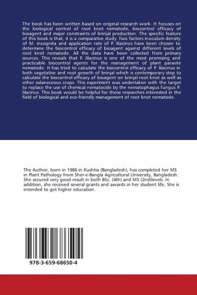 The book has been written based on original research work. It focuses on the biological control of root knot nematode, biocontrol efficacy of bioagent and major constraints of brinjal production. The specific feature of this book is that, it is a comparative study. Two factors inoculum density of M. incognita and application rate of P. lilacinus have been chosen to determine the biocontrol efficacy of bioagent against different levels of root knot nematode. All the data have been collected from primary sources. This reveals that P. lilacinus is one of the most promising and practicable biocontrol agents for the management of plant parasite nematode. It has tried to calculate the biocontrol efficacy of P. lilacinus in both vegetative and root growth of brinjal which is contemporary step to calculate the biocontrol efficacy of bioagent on brinjal root knot as well as other solaneceous crops. This experiment was undertaken with the target to replace the use of chemical nematocide bythe nematophagus fungus P. lilacinus. This book would be helpful for those researches interested in the field of biological and eco-friendly management of root knot nematode.