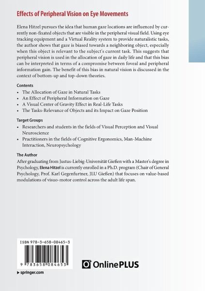 Elena Hitzel pursues the idea that human gaze locations are influenced by currently non-fixated objects that are visible in the peripheral visual field. Using eye tracking equipment and a Virtual Reality system to provide naturalistic tasks, the author shows that gaze is biased towards a neighboring object, especially when this object is relevant to the subject's current task. This suggests that peripheral vision is used in the allocation of gaze in daily life and that this bias can be interpreted in terms of a compromise between foveal and peripheral information gain. The benefit of this bias in natural vision is discussed in the context of bottom-up and top-down theories.