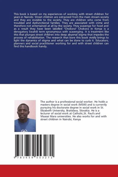 This book is based on my experiences of working with street children for years in Nairobi. Street children are ostracized from the main stream society and they are invisible to the society. They are children who come from troubled and dysfunctional families. They are associated with crime and therefore not entertained at all by the society. They scavenge for food and as a result they have been labelled "Chokora" Chokora in Kenya is a derogatory Swahili term synonymous with scavenging. It is treatment like this that plunges street children into deep abysmal stigma that impedes the process of rehabilitation. The research that bore this book vividly brings to light the dynamics of stigma and what can be done to curb it. Educators, planners and social practitioner working for and with street children can find this handbook handy.