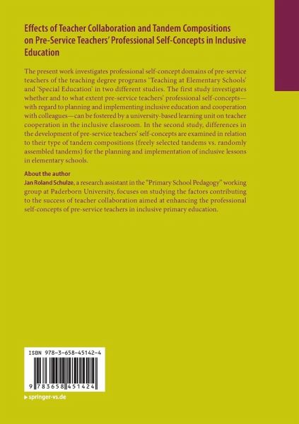 The present work investigates professional self-concept domains of pre-service teachers of the teaching degree programs 'Teaching at Elementary Schools' and 'Special Education' in two different studies. The first study investigates whether and to what extent pre-service teachers' professional self-concepts - with regard to planning and implementing inclusive education and cooperation with colleagues - can be fostered by a university-based learning unit on teacher cooperation in the inclusive classroom. In the second study, differences in the development of pre-service teachers' self-concepts are examined in relation to their type of tandem compositions (freely selected tandems vs. randomly assembled tandems) for the planning and implementation of inclusive lessons in elementary schools.