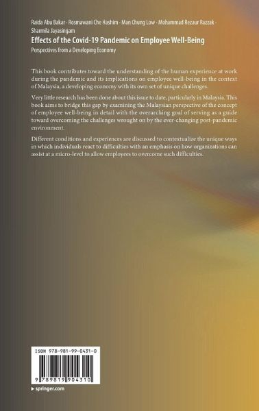 This book contributes toward the understanding of the human experience at work during the pandemic and its implications on employee well-being in the context of Malaysia, a developing economy with its own set of unique challenges. Very little research has been done about this issue to date, particularly in Malaysia. This book aims to bridge this gap by examining the Malaysian perspective of the concept of employee well-being in detail with the overarching goal of serving as a guide toward overcoming the challenges wrought on by the ever-changing post-pandemic environment. Different conditions and experiences are discussed to contextualize the unique ways in which individuals react to difficulties with an emphasis on how organizations can assist at a micro-level to allow employees to overcome such difficulties.