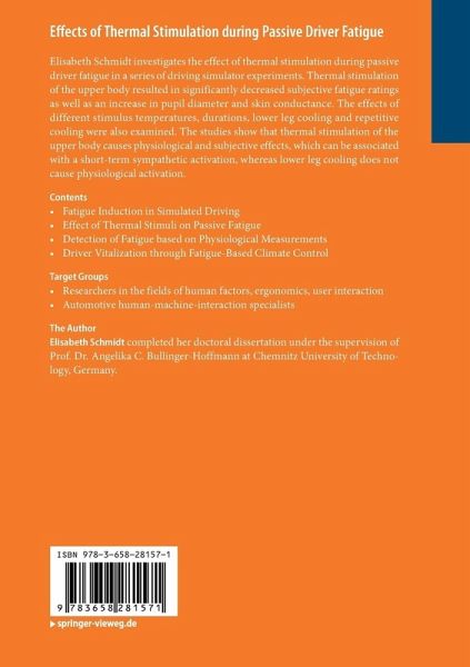 Elisabeth Schmidt investigates the effect of thermal stimulation during passive driver fatigue in a series of driving simulator experiments. Thermal stimulation of the upper body resulted in significantly decreased subjective fatigue ratings as well as an increase in pupil diameter and skin conductance. The effects of different stimulus temperatures, durations, lower leg cooling and repetitive cooling were also examined. The studies show that thermal stimulation of the upper body causes physiological and subjective effects, which can be associated with a short-term sympathetic activation, whereas lower leg cooling does not cause physiological activation.