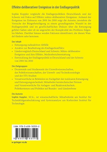 Sophie Kuppler vergleicht die Endlagerpolitiken Deutschlands und der Schweiz mit Fokus auf Effekte mikro-deliberativer Ereignisse. Anhand der Ereignisse im Zeitraum von 2001 bis 2010 zeigt die Autorin, inwiefern die Versuche der Bürgerbeteiligung zu einem grundlegenden Wandel in der Endlagerpolitik und im gesellschaftlichen Diskurs über die Entsorgung geführt haben oder ob sie angesichts der Komplexität des Problems folgenlos blieben. Darüber hinaus werden Faktoren identifiziert, die diesen Wandel fördern oder hemmen.