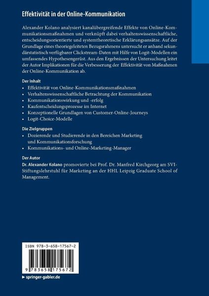 Alexander Kolano analysiert kanalübergreifende Effekte von Online-Kommunikationsmaßnahmen und verknüpft dabei verhaltenswissenschaftliche, entscheidungsorientierte und systemtheoretische Erklärungsansätze. Auf der Grundlage eines theoriegeleiteten Bezugsrahmens untersucht er anhand sekundärstatistisch verfügbarer Clickstream-Daten mit Hilfe von Logit-Modellen ein umfassendes Hypothesengerüst. Aus den Ergebnissen der Untersuchung leitet der Autor Implikationen für die Verbesserung der Effektivität von Maßnahmen der Online-Kommunikation ab.