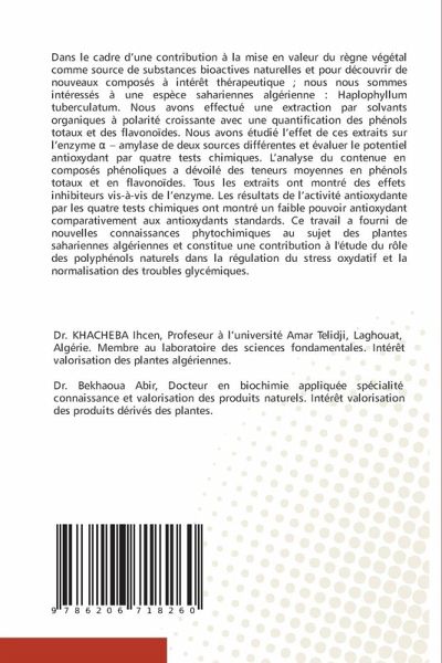 Dans le cadre d'une contribution à la mise en valeur du règne végétal comme source de substances bioactives naturelles et pour découvrir de nouveaux composés à intérêt thérapeutique ; nous nous sommes intéressés à une espèce sahariennes algérienne : Haplophyllum tuberculatum. Nous avons effectué une extraction par solvants organiques à polarité croissante avec une quantification des phénols totaux et des flavonoïdes. Nous avons étudié l'effet de ces extraits sur l'enzyme - amylase de deux sources différentes et évaluer le potentiel antioxydant par quatre tests chimiques. L'analyse du contenue en composés phénoliques a dévoilé des teneurs moyennes en phénols totaux et en flavonoïdes. Tous les extraits ont montré des effets inhibiteurs vis-à-vis de l'enzyme. Les résultats de l'activité antioxydante par les quatre tests chimiques ont montré un faible pouvoir antioxydant comparativement aux antioxydants standards. Ce travail a fourni de nouvelles connaissances phytochimiques au sujet des plantes sahariennes algériennes et constitue une contribution à l'étude du rôle des polyphénols naturels dans la régulation du stress oxydatif et la normalisation des troubles glycémiques.