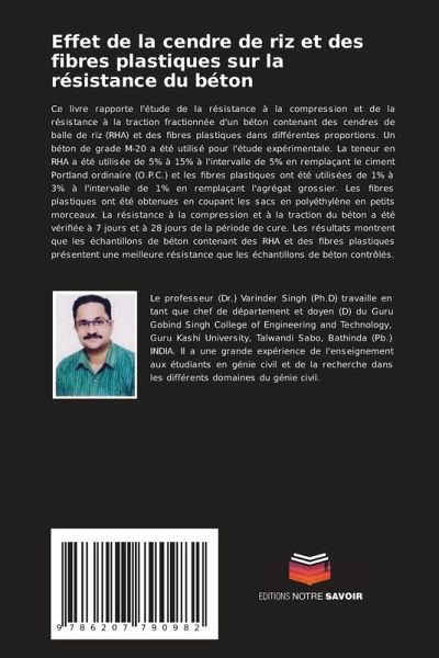 Ce livre rapporte l'étude de la résistance à la compression et de la résistance à la traction fractionnée d'un béton contenant des cendres de balle de riz (RHA) et des fibres plastiques dans différentes proportions. Un béton de grade M-20 a été utilisé pour l'étude expérimentale. La teneur en RHA a été utilisée de 5% à 15% à l'intervalle de 5% en remplaçant le ciment Portland ordinaire (O.P.C.) et les fibres plastiques ont été utilisées de 1% à 3% à l'intervalle de 1% en remplaçant l'agrégat grossier. Les fibres plastiques ont été obtenues en coupant les sacs en polyéthylène en petits morceaux. La résistance à la compression et à la traction du béton a été vérifiée à 7 jours et à 28 jours de la période de cure. Les résultats montrent que les échantillons de béton contenant des RHA et des fibres plastiques présentent une meilleure résistance que les échantillons de béton contrôlés.