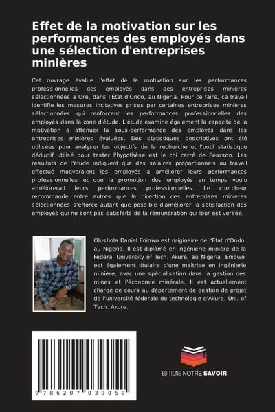 Cet ouvrage évalue l'effet de la motivation sur les performances professionnelles des employés dans des entreprises minières sélectionnées à Ore, dans l'État d'Ondo, au Nigeria. Pour ce faire, ce travail identifie les mesures incitatives prises par certaines entreprises minières sélectionnées qui renforcent les performances professionnelles des employés dans la zone d'étude. L'étude examine également la capacité de la motivation à atténuer la sous-performance des employés dans les entreprises minières évaluées. Des statistiques descriptives ont été utilisées pour analyser les objectifs de la recherche et l'outil statistique déductif utilisé pour tester l'hypothèse est le chi carré de Pearson. Les résultats de l'étude indiquent que des salaires proportionnels au travail effectué motiveraient les employés à améliorer leurs performances professionnelles et que la promotion des employés en temps voulu améliorerait leurs performances professionnelles. Le chercheur recommande entre autres que la direction des entreprises minières sélectionnées s'efforce autant que possible d'améliorer la satisfaction des employés qui ne sont pas satisfaits de la rémunération qui leur est versée.