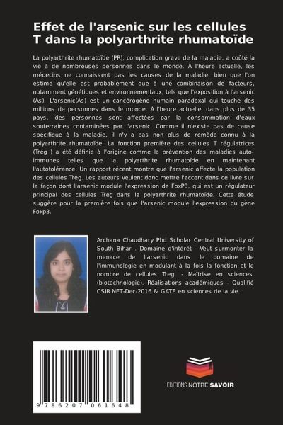La polyarthrite rhumatoïde (PR), complication grave de la maladie, a coûté la vie à de nombreuses personnes dans le monde. À l'heure actuelle, les médecins ne connaissent pas les causes de la maladie, bien que l'on estime qu'elle est probablement due à une combinaison de facteurs, notamment génétiques et environnementaux, tels que l'exposition à l'arsenic (As). L'arsenic(As) est un cancérogène humain paradoxal qui touche des millions de personnes dans le monde. À l'heure actuelle, dans plus de 35 pays, des personnes sont affectées par la consommation d'eaux souterraines contaminées par l'arsenic. Comme il n'existe pas de cause spécifique à la maladie, il n'y a pas non plus de remède connu à la polyarthrite rhumatoïde. La fonction première des cellules T régulatrices (Treg ) a été définie à l'origine comme la prévention des maladies auto-immunes telles que la polyarthrite rhumatoïde en maintenant l'autotolérance. Un rapport récent montre que l'arsenic affecte la population des cellules Treg. Les auteurs veulent donc mettre l'accent dans ce livre sur la façon dont l'arsenic module l'expression de FoxP3, qui est un régulateur principal des cellules Treg dans la polyarthrite rhumatoïde. Cette étude suggère pour la première fois que l'arsenic module l'expression du gène Foxp3.