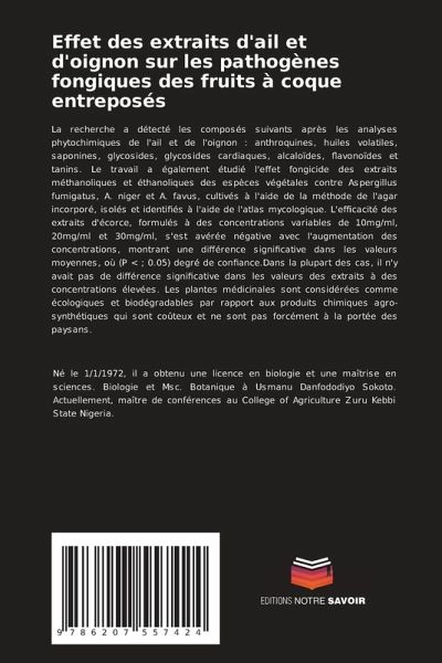 La recherche a détecté les composés suivants après les analyses phytochimiques de l'ail et de l'oignon : anthroquines, huiles volatiles, saponines, glycosides, glycosides cardiaques, alcaloïdes, flavonoïdes et tanins. Le travail a également étudié l'effet fongicide des extraits méthanoliques et éthanoliques des espèces végétales contre Aspergillus fumigatus, A. niger et A. favus, cultivés à l'aide de la méthode de l'agar incorporé, isolés et identifiés à l'aide de l'atlas mycologique. L'efficacité des extraits d'écorce, formulés à des concentrations variables de 10mg/ml, 20mg/ml et 30mg/ml, s'est avérée négative avec l'augmentation des concentrations, montrant une différence significative dans les valeurs moyennes, où (P < ; 0.05) degré de confiance.Dans la plupart des cas, il n'y avait pas de différence significative dans les valeurs des extraits à des concentrations élevées. Les plantes médicinales sont considérées comme écologiques et biodégradables par rapport aux produits chimiques agro-synthétiques qui sont coûteux et ne sont pas forcément à la portée des paysans.