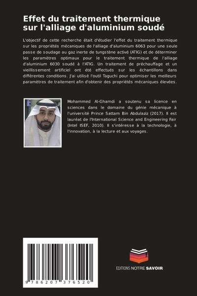 L'objectif de cette recherche était d'étudier l'effet du traitement thermique sur les propriétés mécaniques de l'alliage d'aluminium 6063 pour une seule passe de soudage au gaz inerte de tungstène activé (ATIG) et de déterminer les paramètres optimaux pour le traitement thermique de l'alliage d'aluminium 6030 soudé à l'ATIG. Un traitement de préchauffage et un vieillissement artificiel ont été effectués sur les échantillons dans différentes conditions. J'ai utilisé l'outil Taguchi pour optimiser les meilleurs paramètres de traitement afin d'obtenir des propriétés mécaniques élevées.