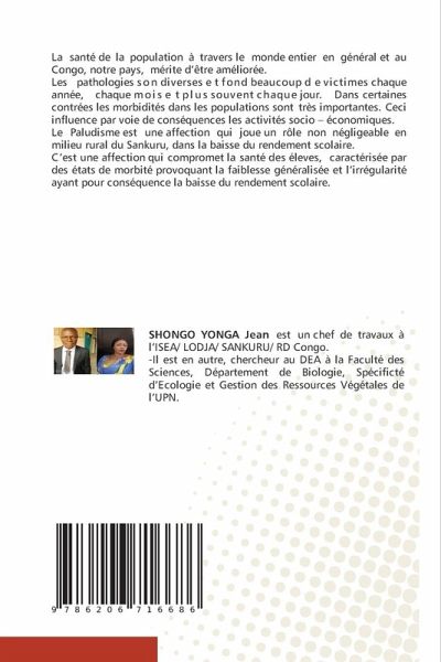 La santé de la population à travers le monde entier en général et au Congo, notre pays, mérite d'être améliorée. Les pathologies son diverses et fond beaucoup de victimes chaque année, chaque mois et plus souvent chaque jour. Dans certaines contrées les morbidités dans les populations sont très importantes. Ceci influence par voie de conséquences les activités socio - économiques.Le Paludisme est une affection qui joue un rôle non négligeable en milieu rural du Sankuru, dans la baisse du rendement scolaire.C'est une affection qui compromet la santé des éleves, caractérisée par des états de morbité provoquant la faiblesse généralisée et l'irrégularité ayant pour conséquence la baisse du rendement scolaire.