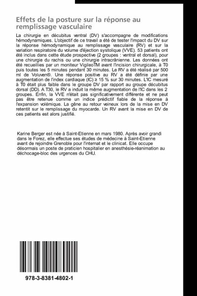 La chirurgie en décubitus ventral (DV) s'accompagne de modifications hémodynamiques. L'objectif de ce travail a été de tester l'impact du DV sur la réponse hémodynamique au remplissage vasculaire (RV) et sur la variation respiratoire du volume d'éjection systolique (VVE). 53 patients ont été inclus dans cette étude prospective (2 groupes : ventral et dorsal), pour une chirurgie du rachis ou une chirurgie intracrânienne. Les données ont été recueillies par un moniteur VigileoTM avant l'incision chirurgicale, à T0 puis toutes les 5 minutes pendant 30 minutes. Le RV a été réalisé par 500 ml de Voluven®. Une réponse positive au RV a été définie par une augmentation de l'index cardiaque (IC) 15 % sur 30 minutes. L'IC mesuré à T0 était plus faible dans le groupe DV par rapport au groupe décubitus dorsal (DD). A T30, le RV a induit la même augmentation de l'IC dans les 2 groupes. Enfin, la VVE n'était pas significativement différente et ne peut pas être retenue comme un indice prédictif fiable de la réponse à l'expansion volémique. La gêne au retour veineux lors de la mise en DV retentit sur le remplissage du myocarde. Un RV avant la mise en DV de ces patients est alors justifié.
