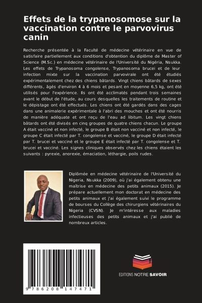 Recherche présentée à la Faculté de médecine vétérinaire en vue de satisfaire partiellement aux conditions d'obtention du diplôme de Master of Science (M.Sc.) en médecine vétérinaire de l'Université du Nigéria, Nsukka. Les effets de Trypanosoma congolense, Trypanosoma brucei et de leur infection mixte sur la vaccination parvovirale ont été étudiés expérimentalement chez des chiens bâtards. Vingt chiens bâtards de sexes différents, âgés d'environ 4 à 6 mois et pesant en moyenne 6,5 kg, ont été utilisés pour l'expérience. Ils ont été acclimatés pendant trois semaines avant le début de l'étude, au cours desquelles les traitements de routine et le dépistage ont été effectués. Les chiens ont été gardés dans des cages dans une animalerie expérimentale à l'abri des mouches et ont été nourris de manière adéquate et ont reçu de l'eau ad libitum. Les vingt chiens bâtards ont été divisés en cinq groupes de quatre chiens chacun. Le groupe A était vacciné et non infecté, le groupe B était non vacciné et non infecté, le groupe C était infecté par T. congolense et vacciné, le groupe D était infecté par T. brucei et vacciné et le groupe E était infecté par T. congolense et T. brucei et vacciné. Les signes cliniques observés chez les chiens étaient les suivants : pyrexie, anorexie, émaciation, léthargie, poils rudes.