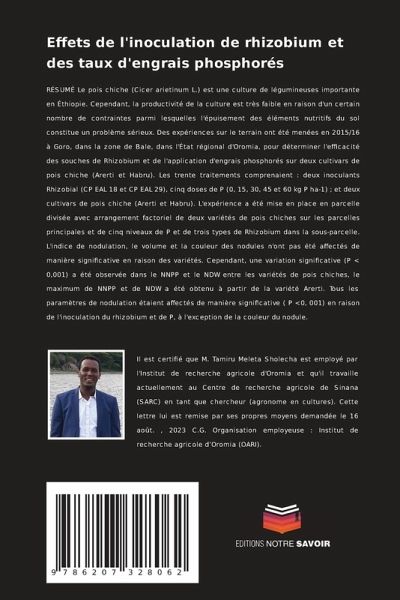 RÉSUMÉ Le pois chiche (Cicer arietinum L.) est une culture de légumineuses importante en Éthiopie. Cependant, la productivité de la culture est très faible en raison d'un certain nombre de contraintes parmi lesquelles l'épuisement des éléments nutritifs du sol constitue un problème sérieux. Des expériences sur le terrain ont été menées en 2015/16 à Goro, dans la zone de Bale, dans l'État régional d'Oromia, pour déterminer l'efficacité des souches de Rhizobium et de l'application d'engrais phosphorés sur deux cultivars de pois chiche (Arerti et Habru). Les trente traitements comprenaient : deux inoculants Rhizobial (CP EAL 18 et CP EAL 29), cinq doses de P (0, 15, 30, 45 et 60 kg P ha-1) ; et deux cultivars de pois chiche (Arerti et Habru). L'expérience a été mise en place en parcelle divisée avec arrangement factoriel de deux variétés de pois chiches sur les parcelles principales et de cinq niveaux de P et de trois types de Rhizobium dans la sous-parcelle. L'indice de nodulation, le volume et la couleur des nodules n'ont pas été affectés de manière significative en raison des variétés. Cependant, une variation significative (P < 0,001) a été observée dans le NNPP et le NDW entre les variétés de pois chiches, le maximum de NNPP et de NDW a été obtenu à partir de la variété Arerti. Tous les paramètres de nodulation étaient affectés de manière significative ( P <0, 001) en raison de l'inoculation du rhizobium et de P, à l'exception de la couleur du nodule.