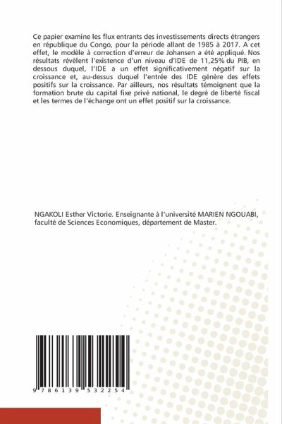 Ce papier examine les flux entrants des investissements directs étrangers en république du Congo, pour la période allant de 1985 à 2017. A cet effet, le modèle à correction d'erreur de Johansen a été appliqué. Nos résultats révèlent l'existence d'un niveau d'IDE de 11,25% du PIB, en dessous duquel, l'IDE a un effet significativement négatif sur la croissance et, au-dessus duquel l'entrée des IDE génère des effets positifs sur la croissance. Par ailleurs, nos résultats témoignent que la formation brute du capital fixe privé national, le degré de liberté fiscal et les termes de l'échange ont un effet positif sur la croissance.